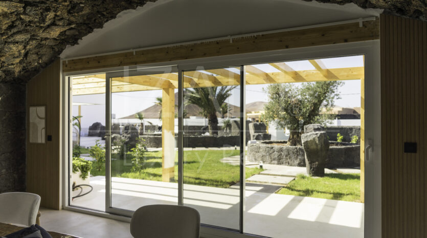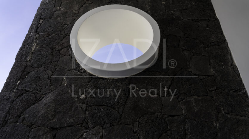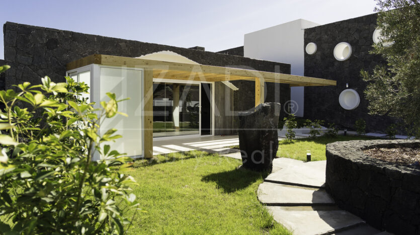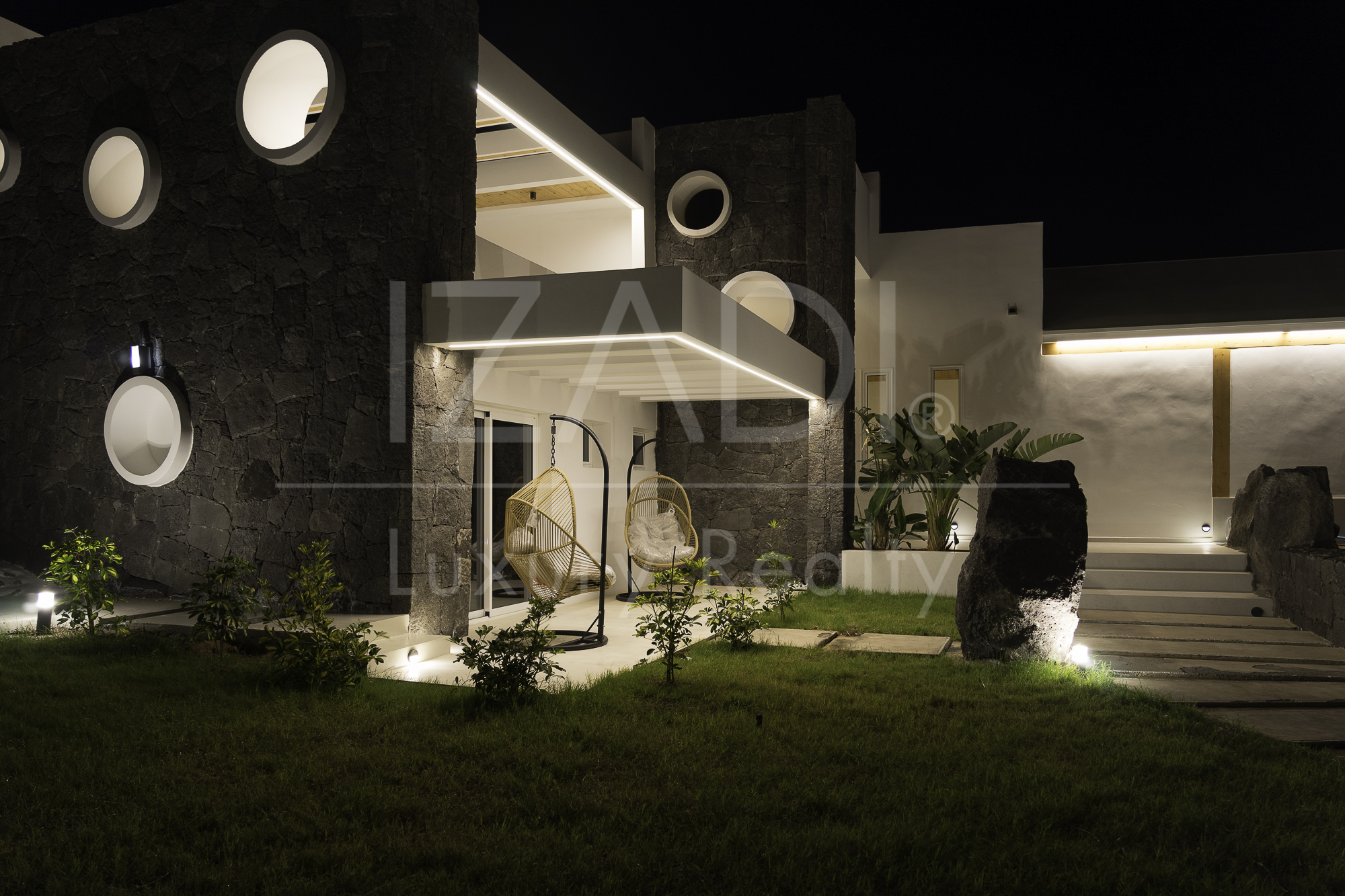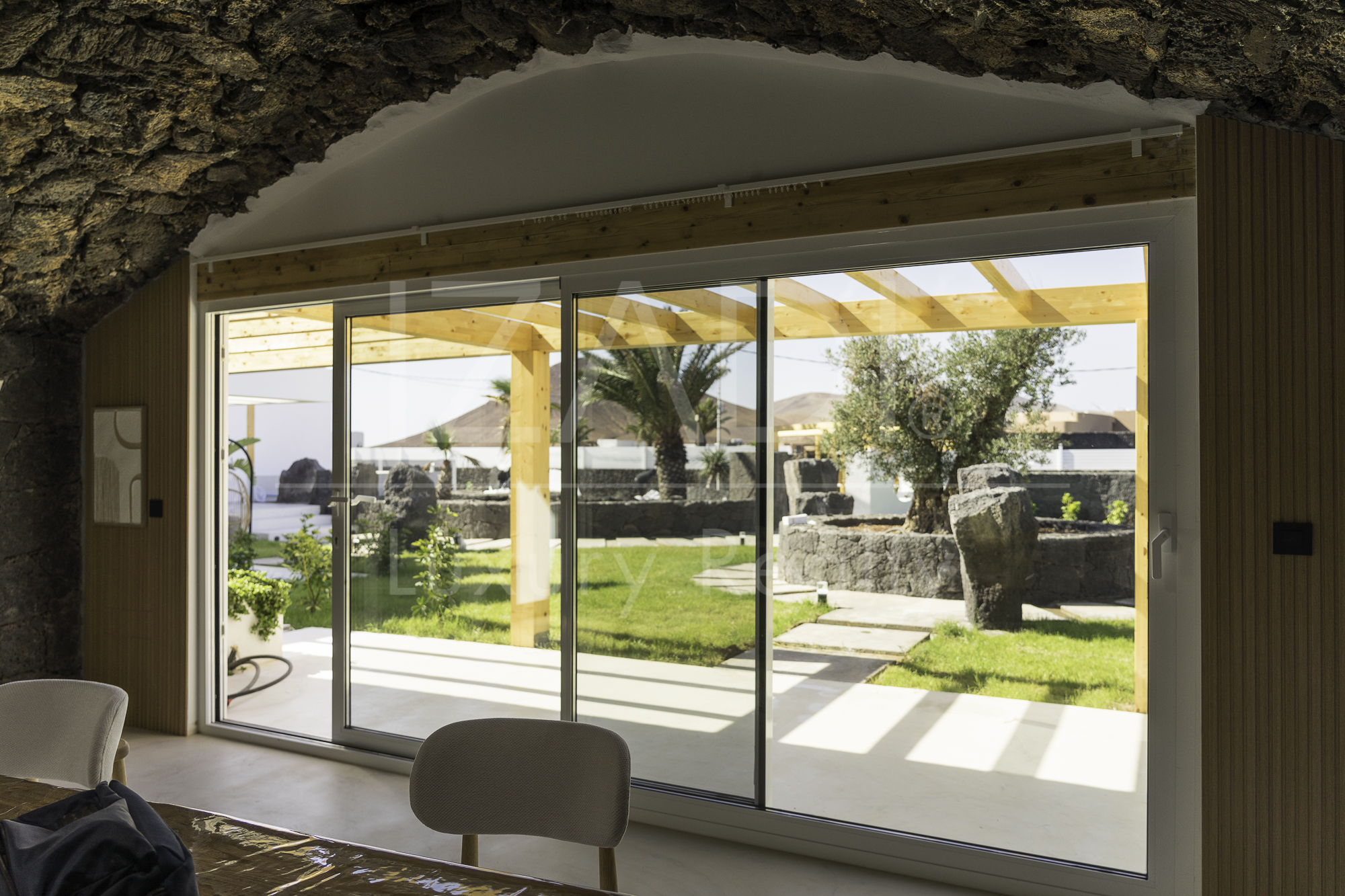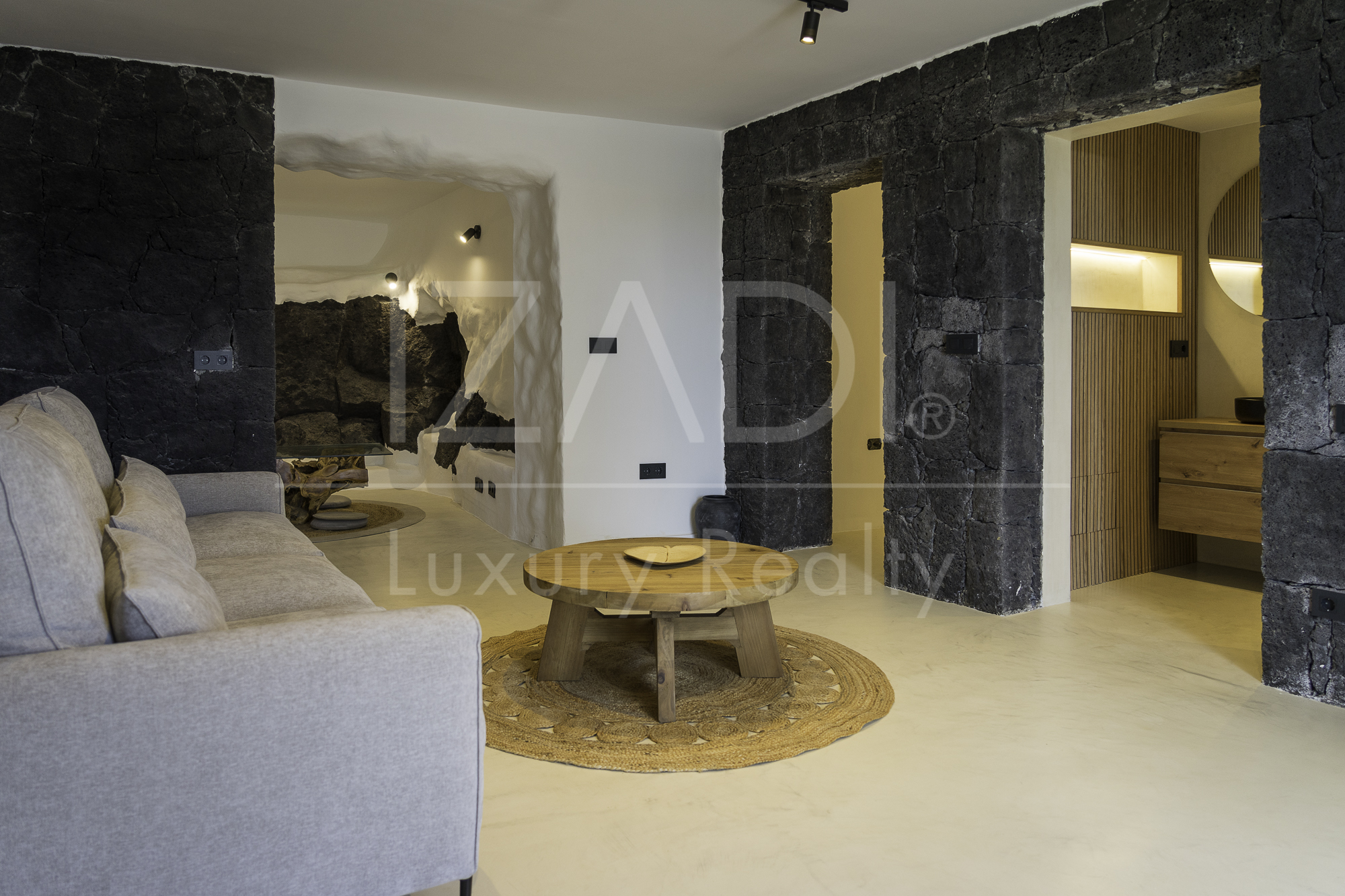 The entrance, protected by an automatic gate and volcanic stone enclosure, preserves privacy and tranquility. And the terrace suspended above the lava field, with its glass floor and steel structure, offers one of the most breathtaking views on the island.