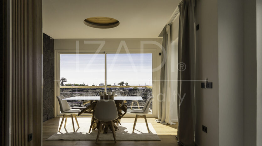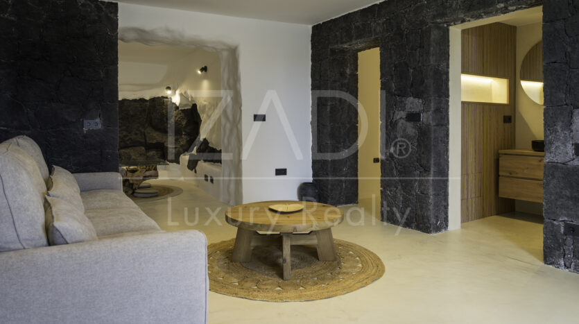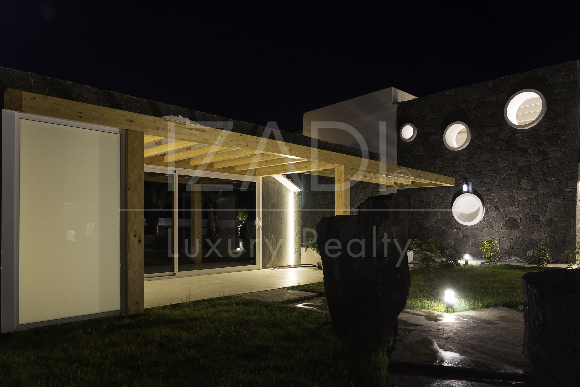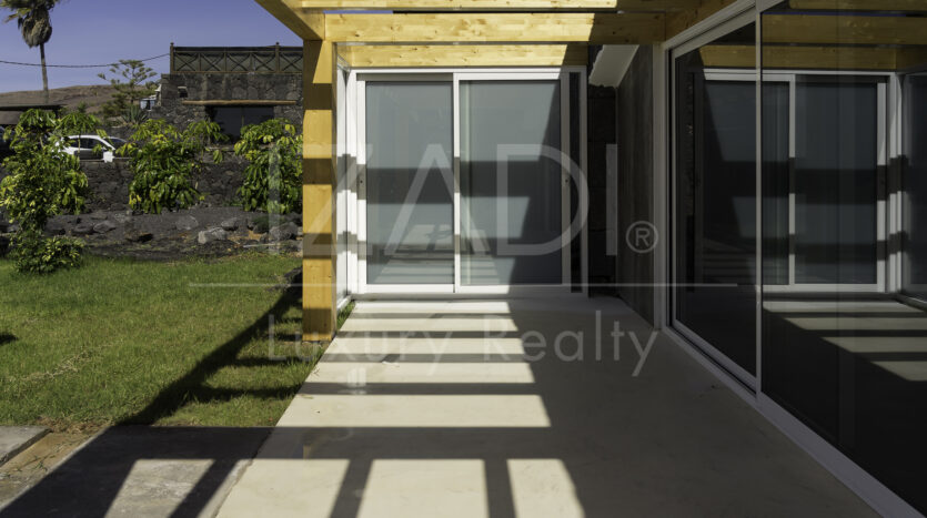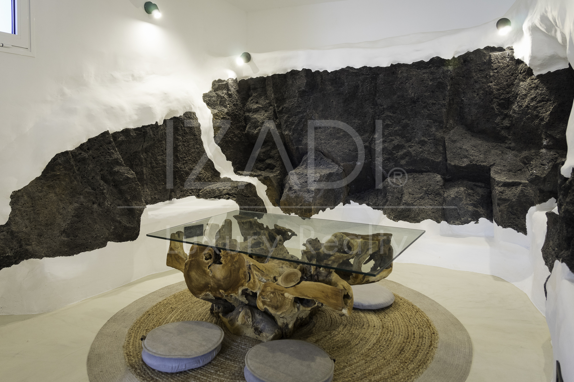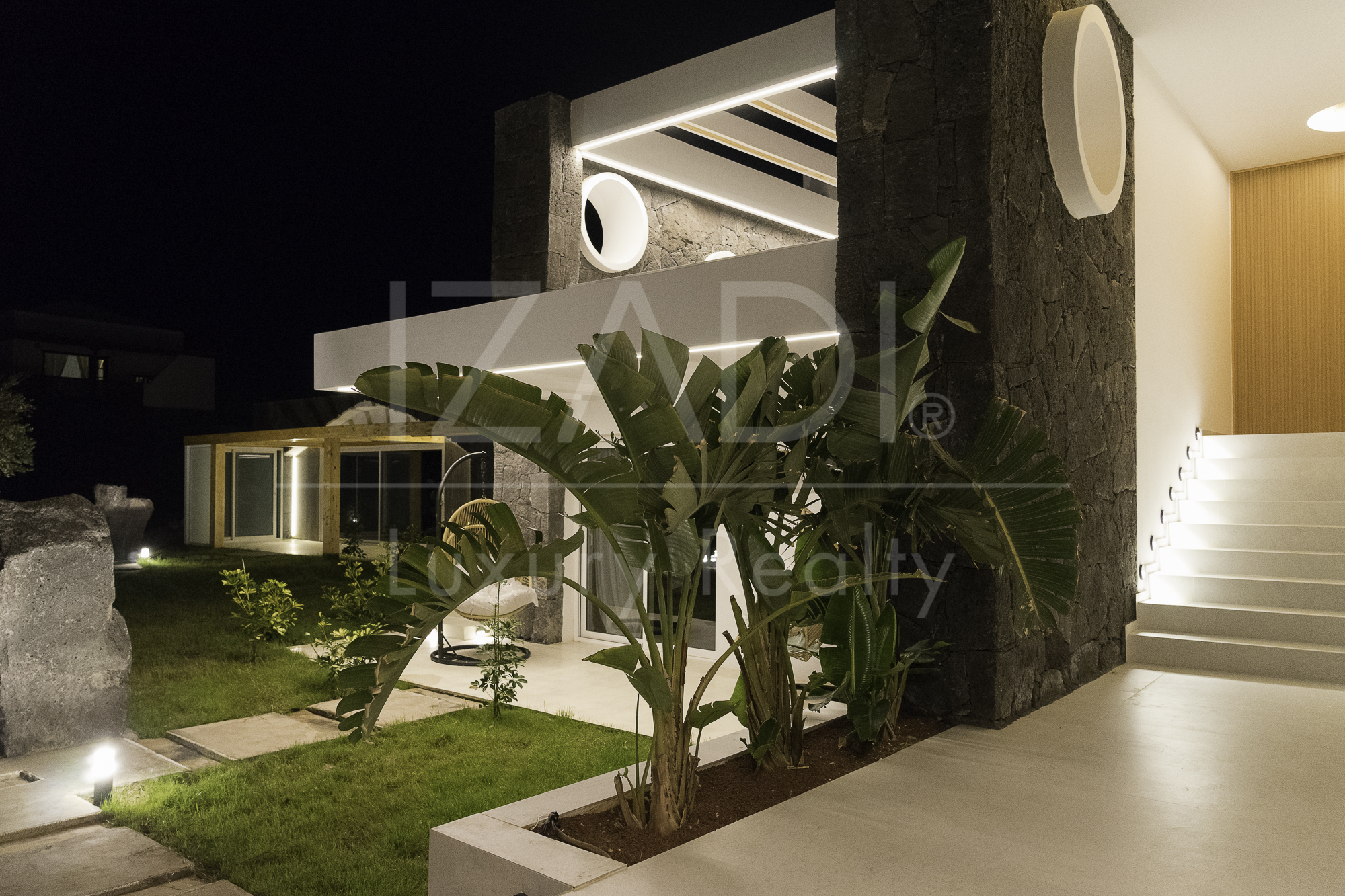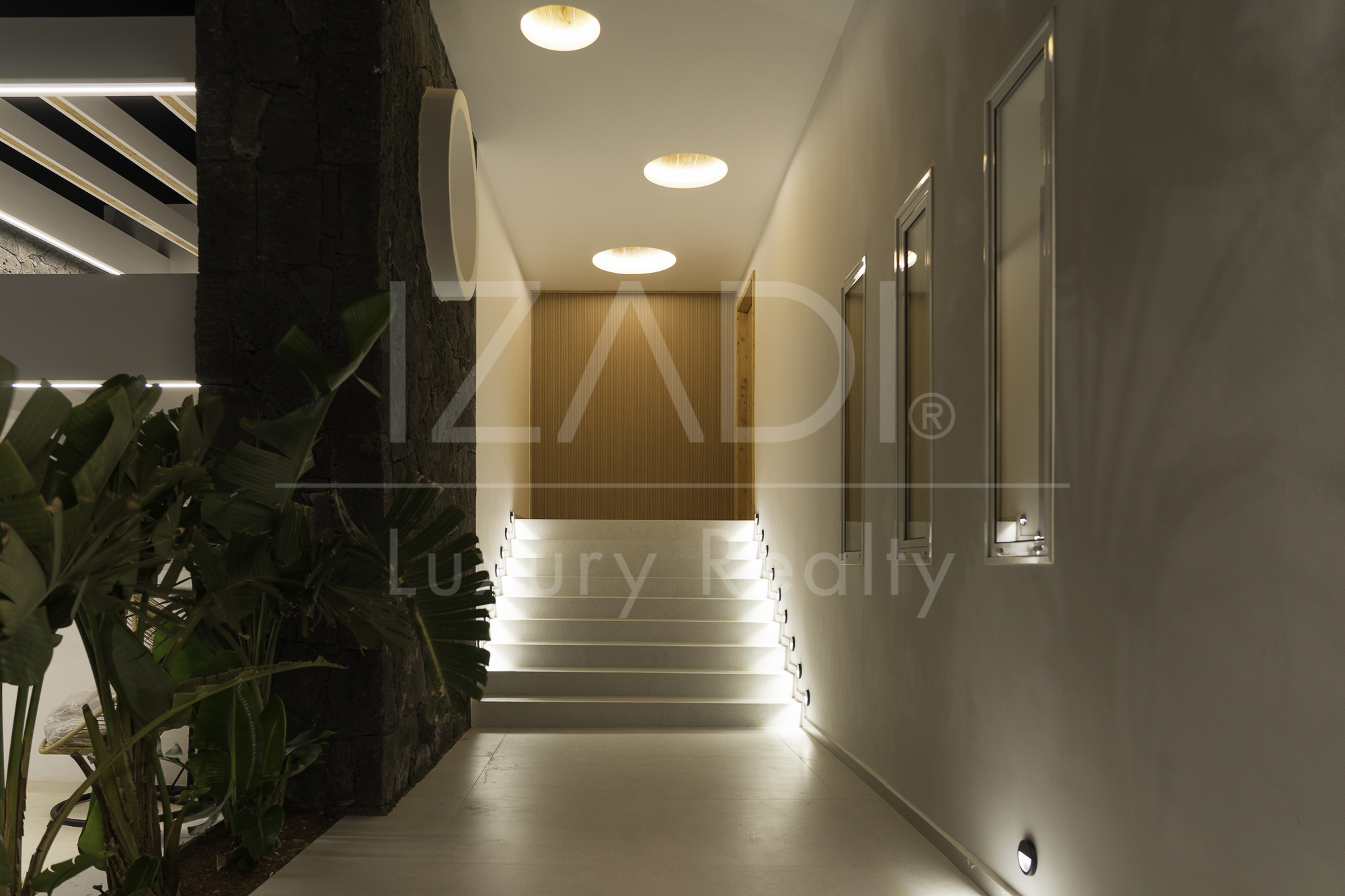 The entrance, protected by an automatic gate and volcanic stone enclosure, preserves privacy and tranquility. And the terrace suspended above the lava field, with its glass floor and steel structure, offers one of the most breathtaking views on the island.