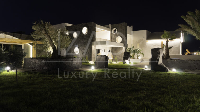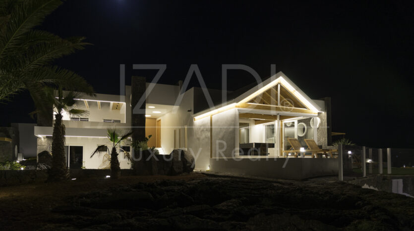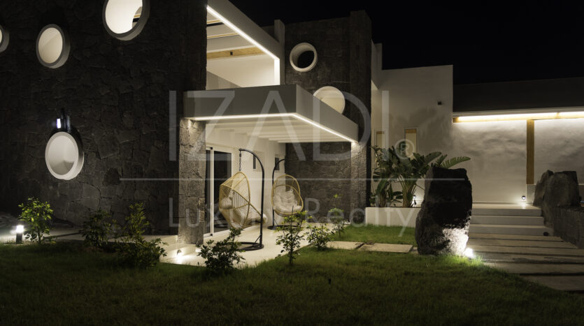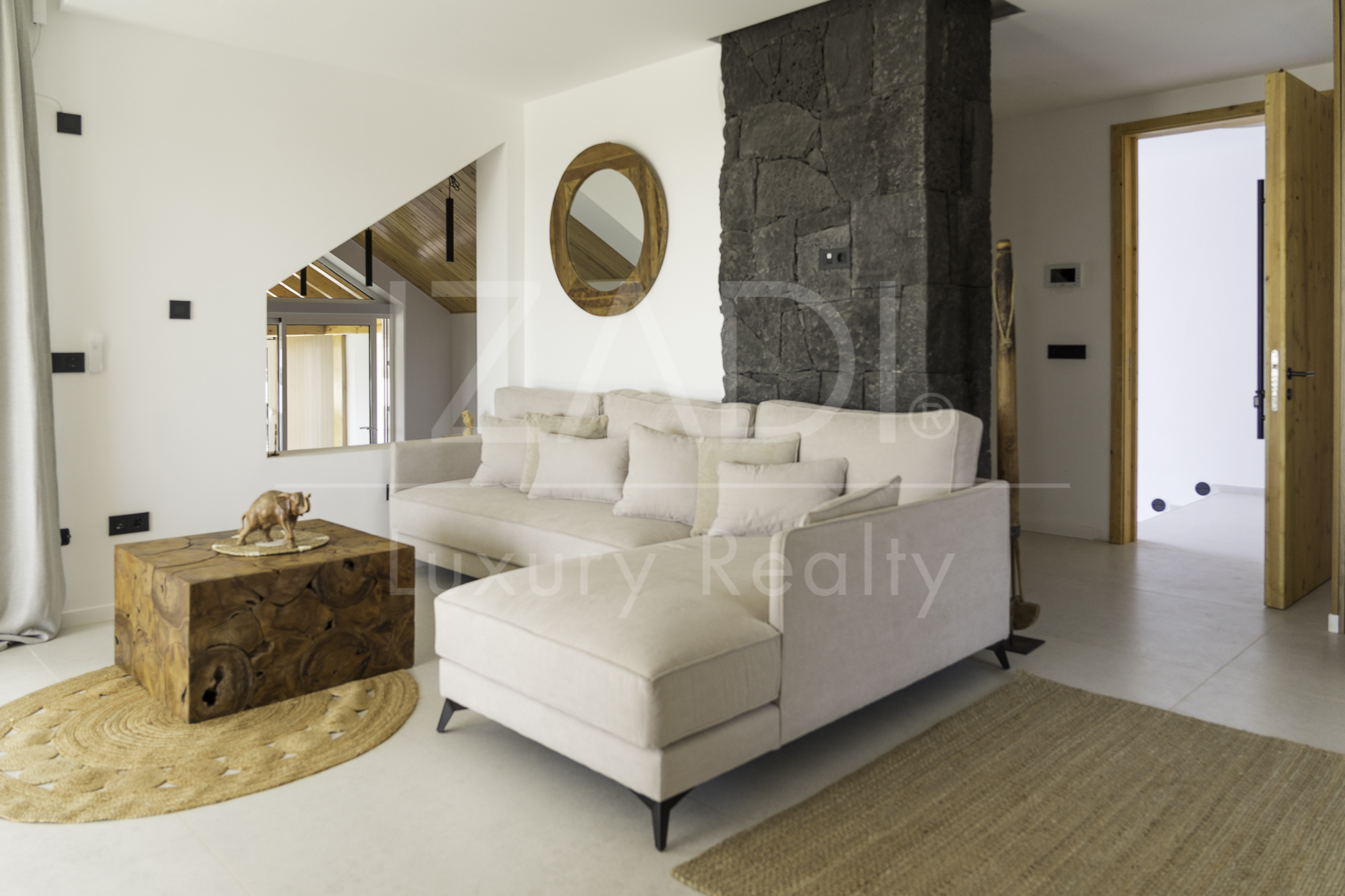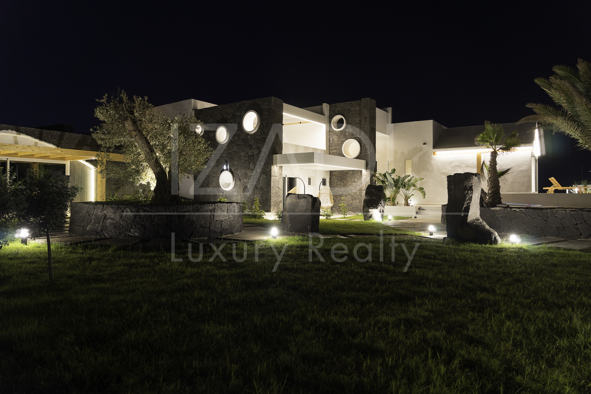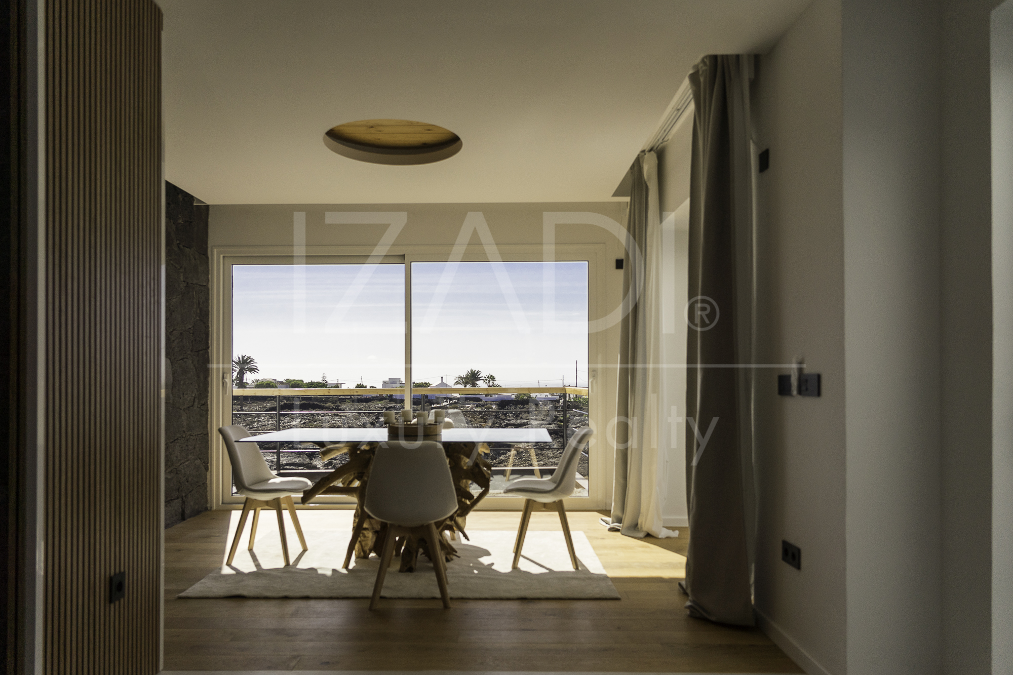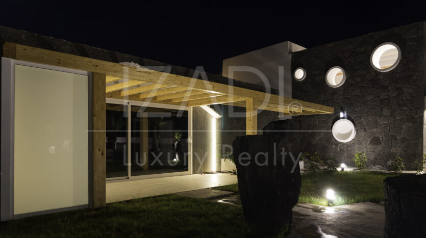 The entrance, protected by an automatic gate and volcanic stone enclosure, preserves privacy and tranquility. And the terrace suspended above the lava field, with its glass floor and steel structure, offers one of the most breathtaking views on the island.