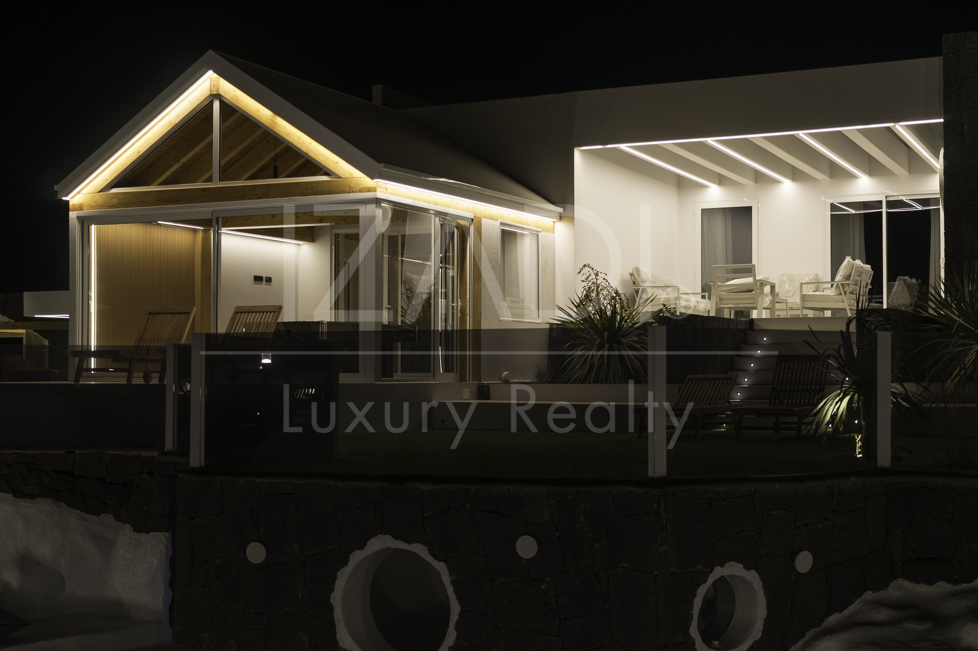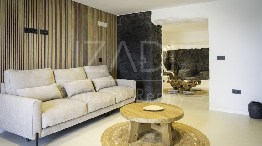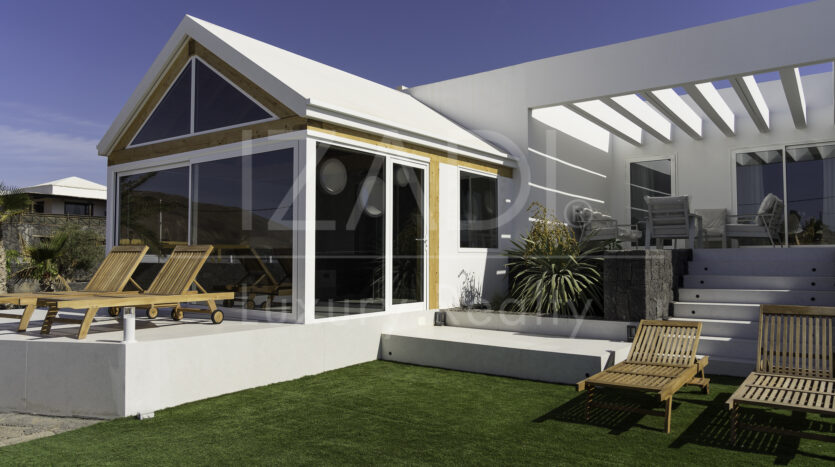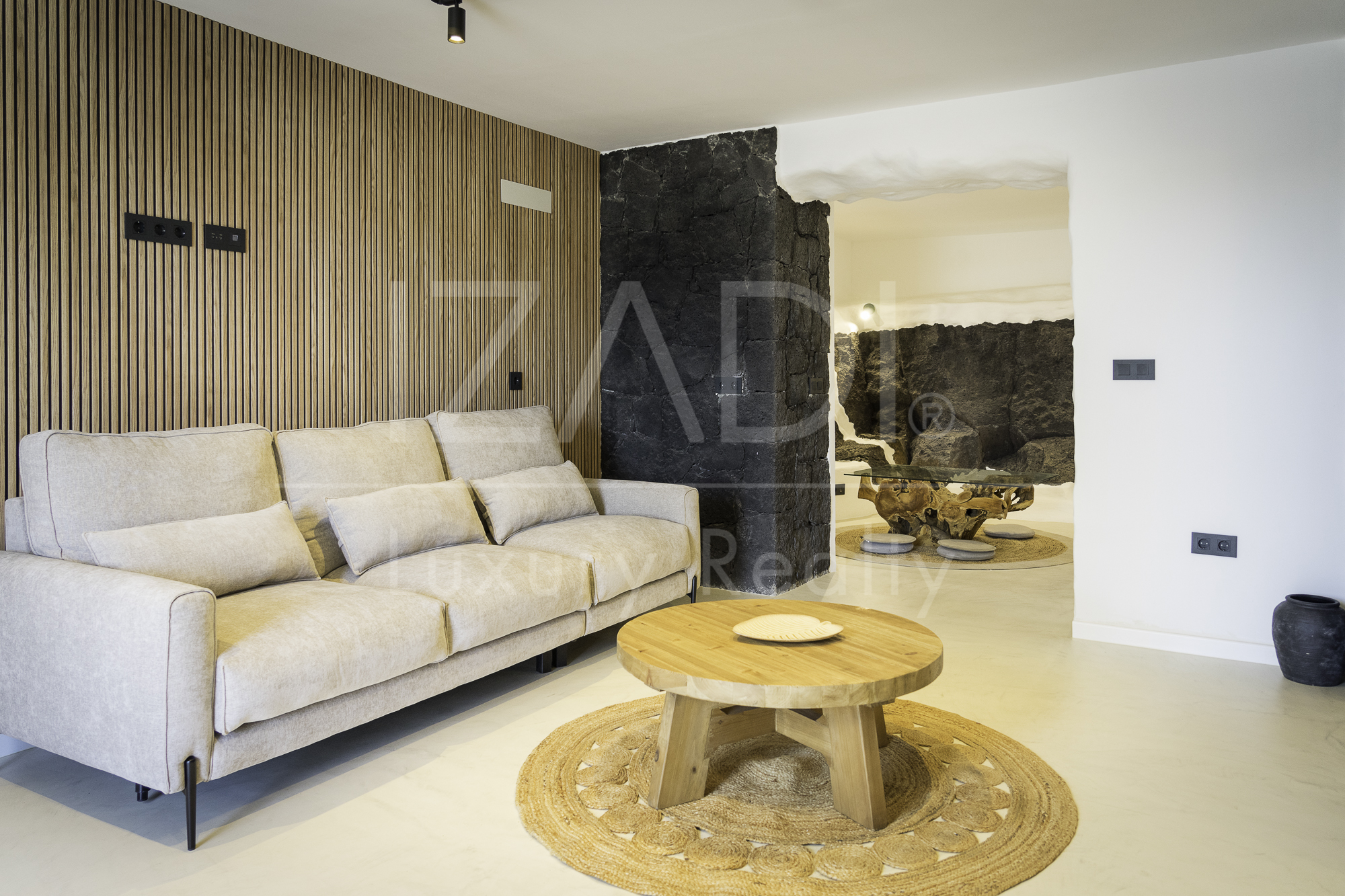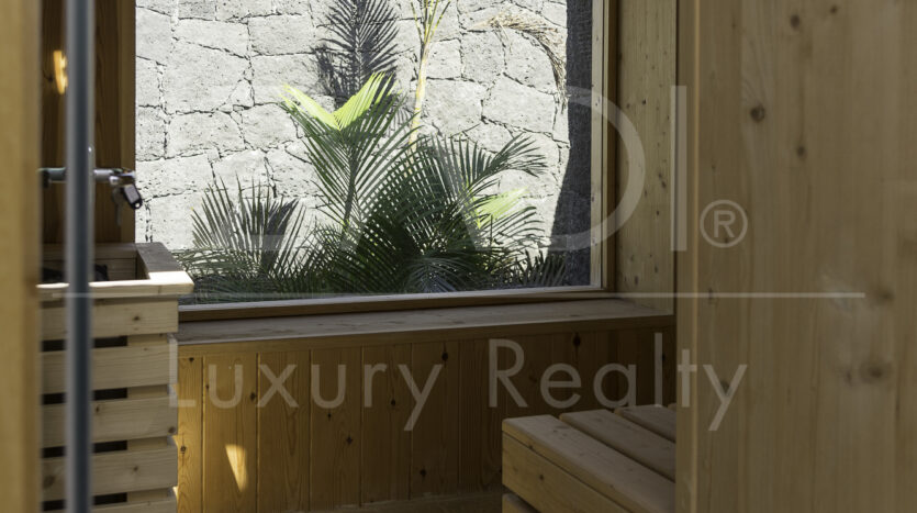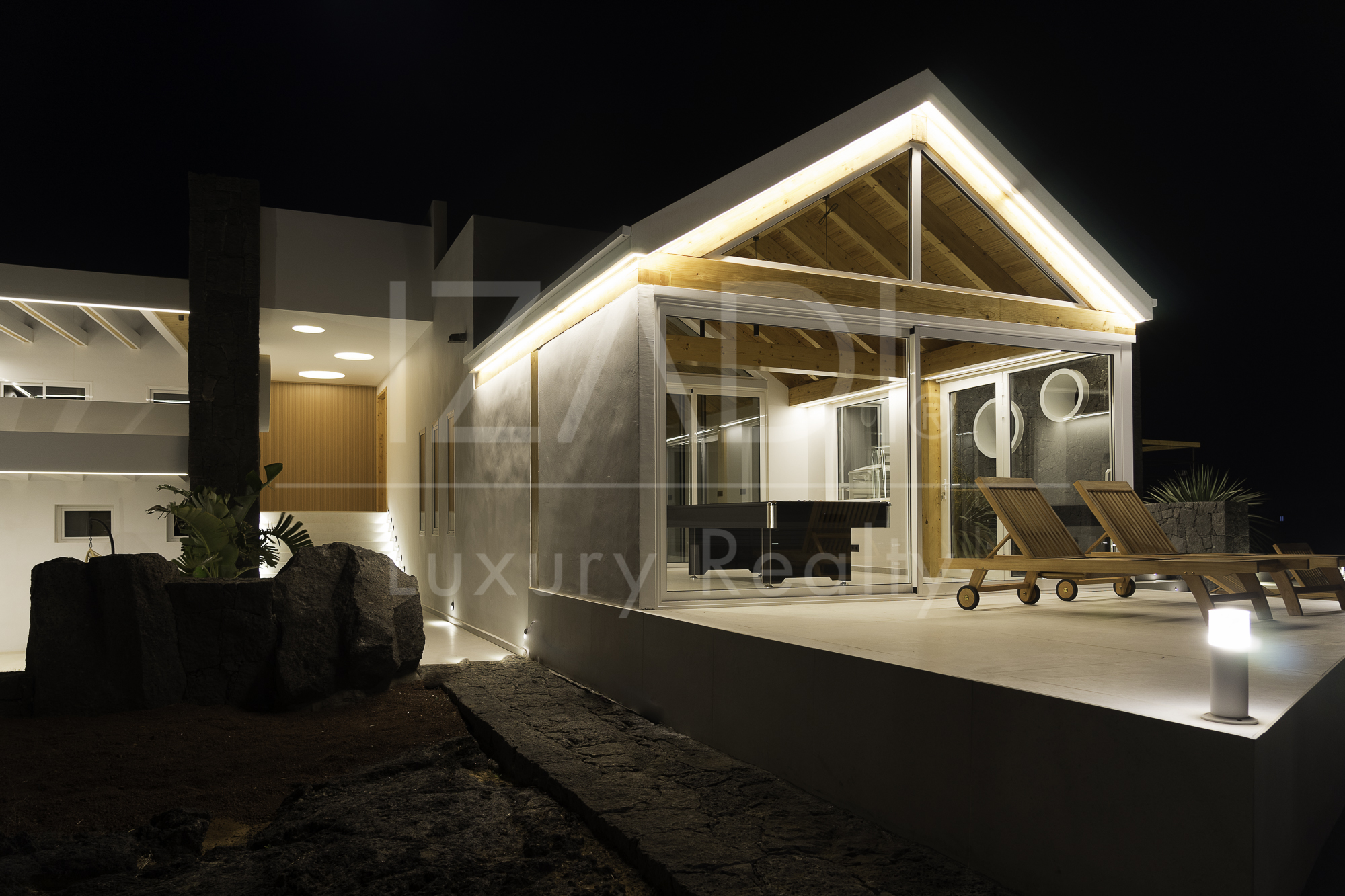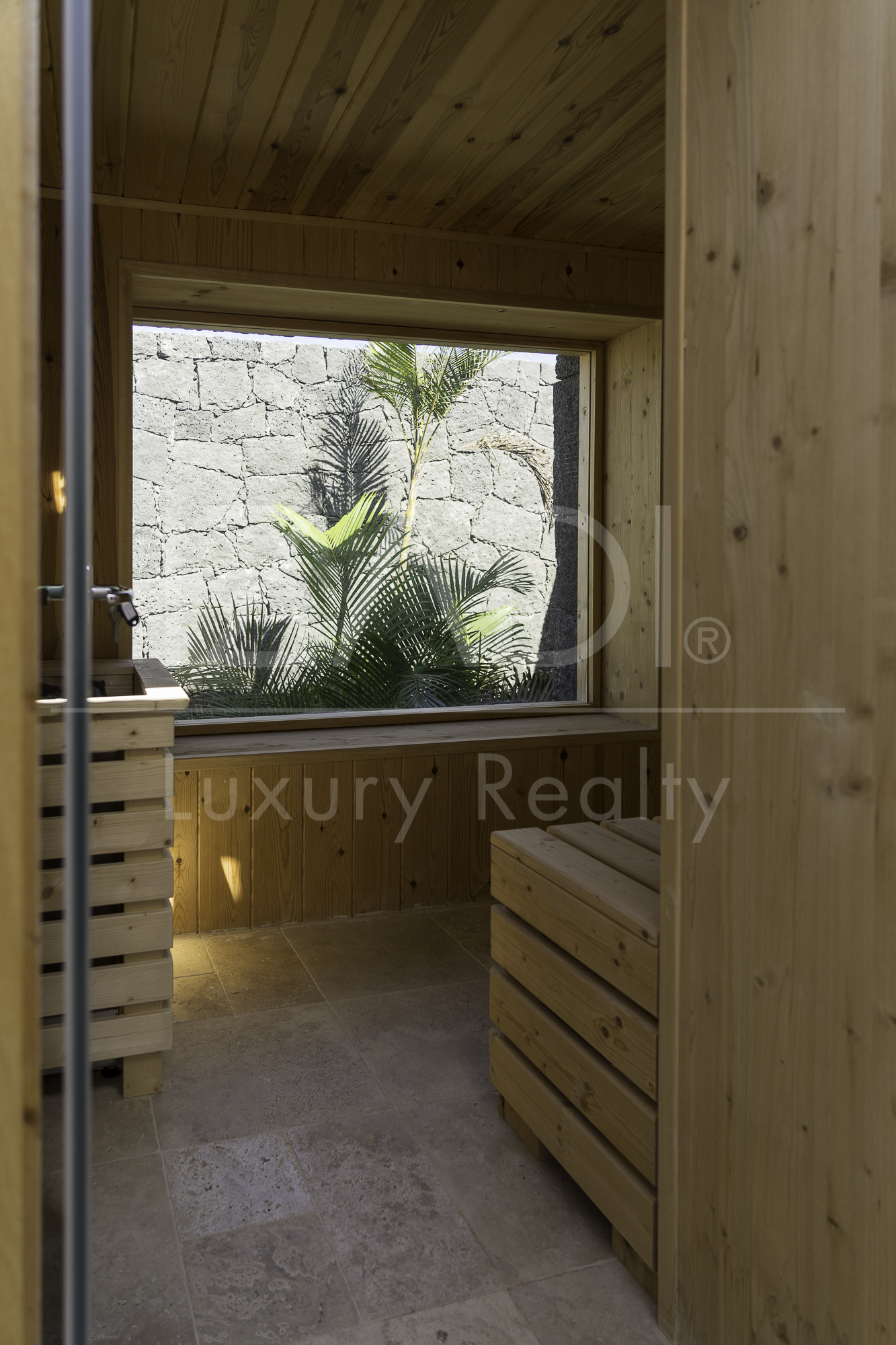 Outside, the grounds open up into terraces and landscaped areas with automatic irrigation, and a swimming pool inspired by the Jameos del Agua, seamlessly integrated into the volcanic rock. Next to it, a private Nordic wood sauna completes a wellness experience that seems to float above the landscape.