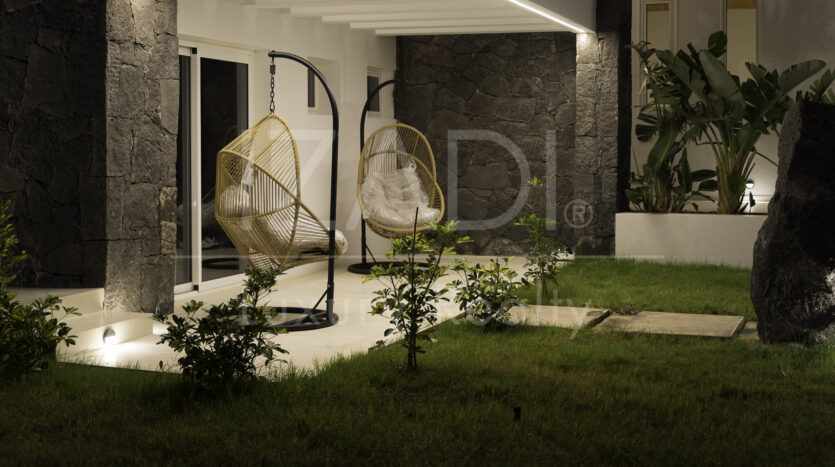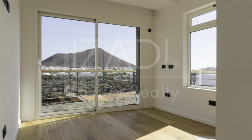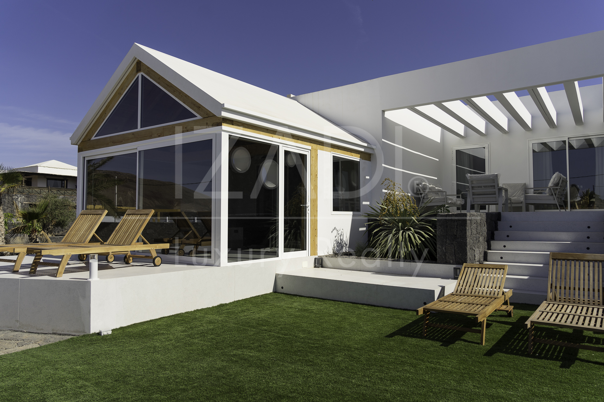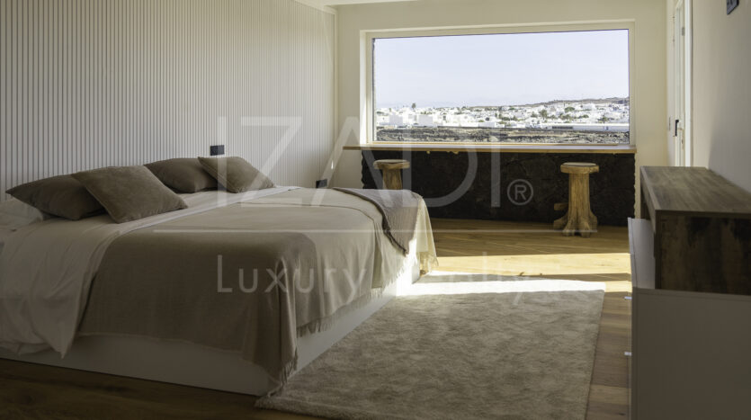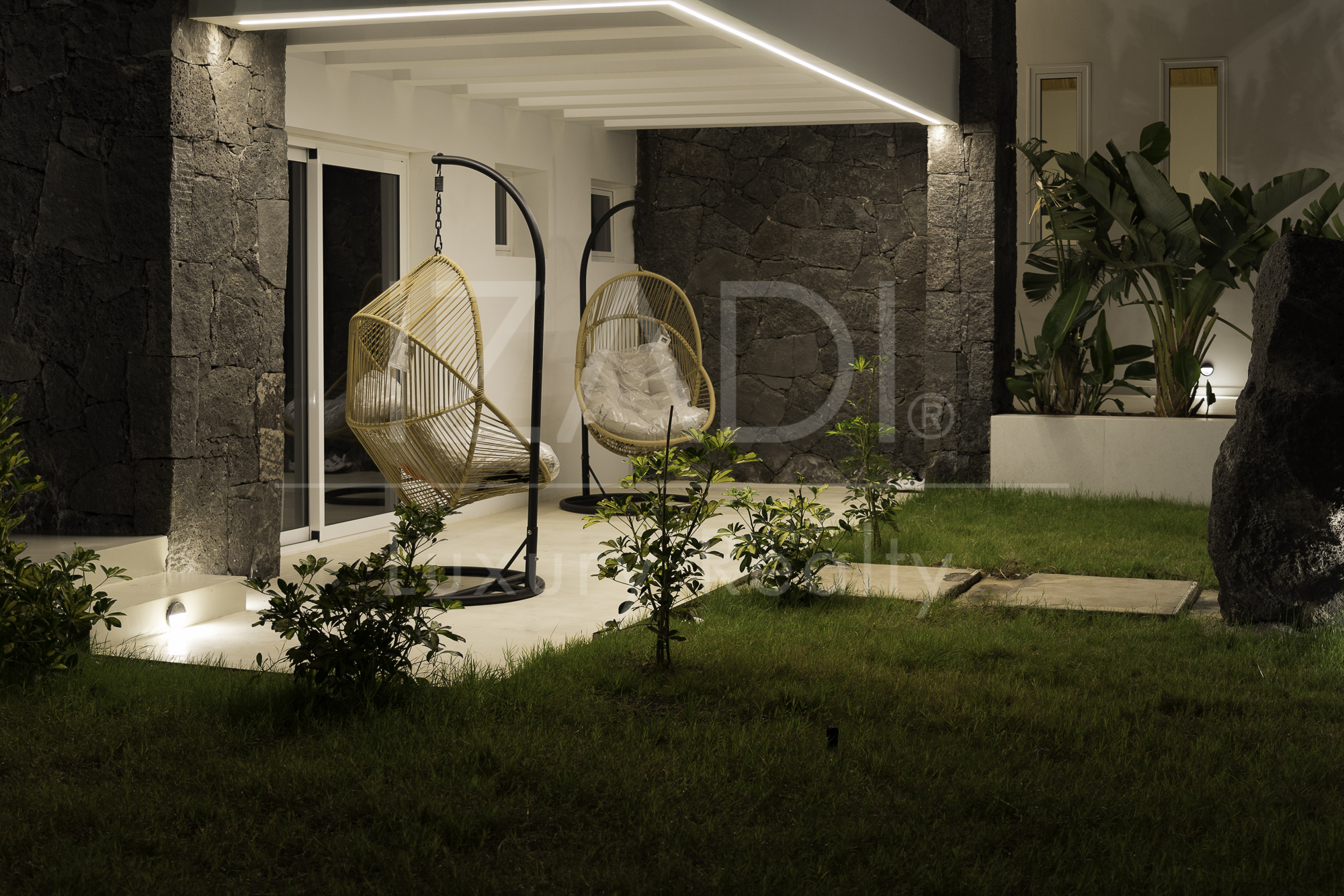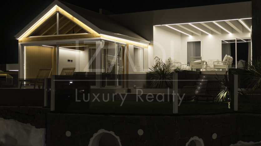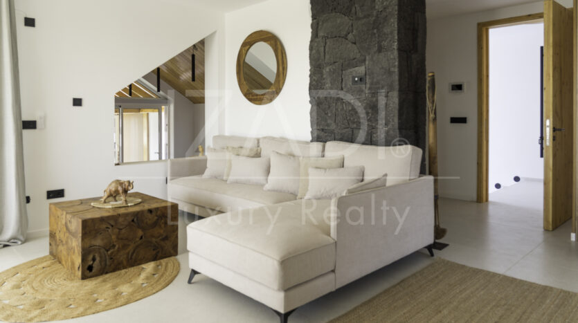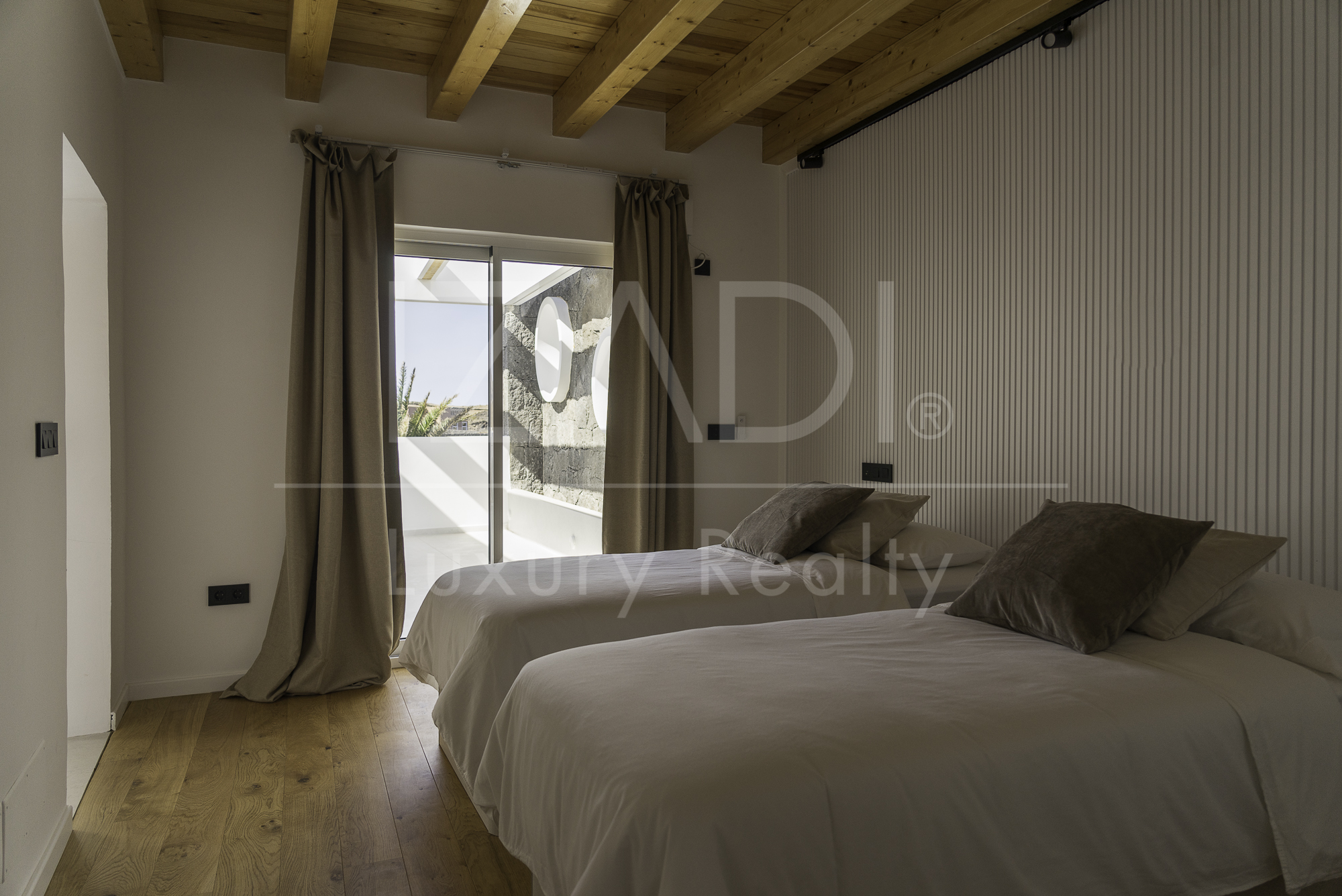 Outside, the grounds open up into terraces and landscaped areas with automatic irrigation, and a swimming pool inspired by the Jameos del Agua, seamlessly integrated into the volcanic rock. Next to it, a private Nordic wood sauna completes a wellness experience that seems to float above the landscape.