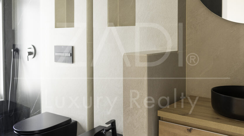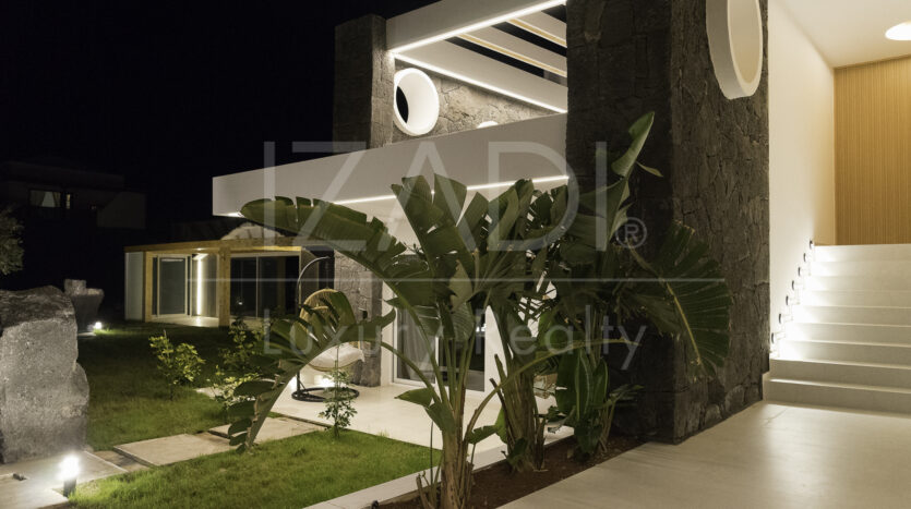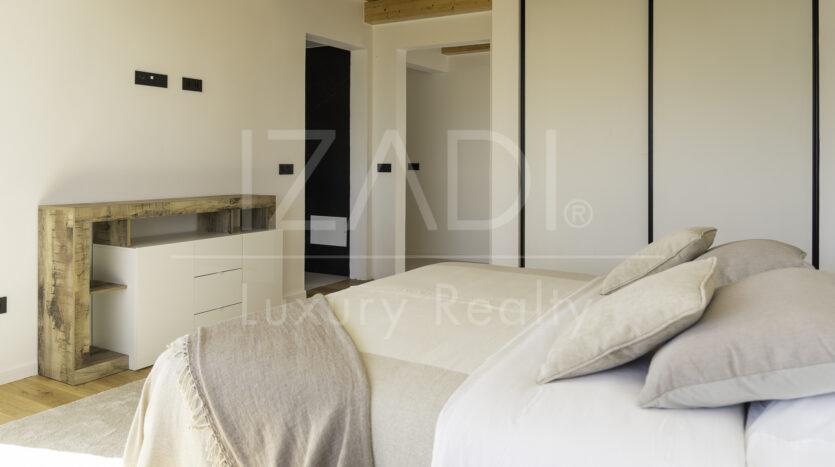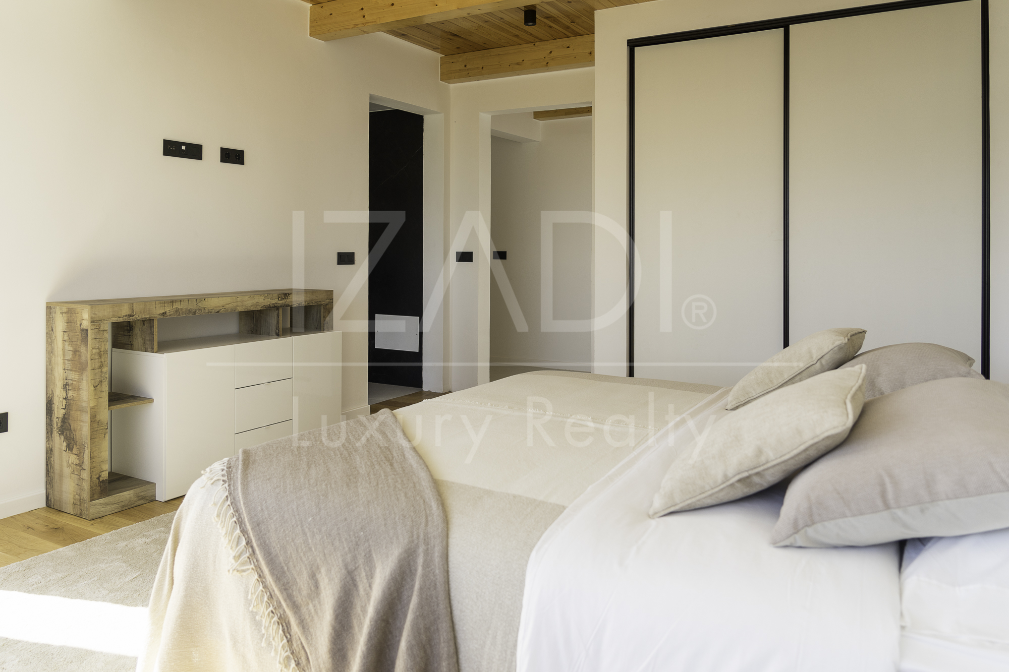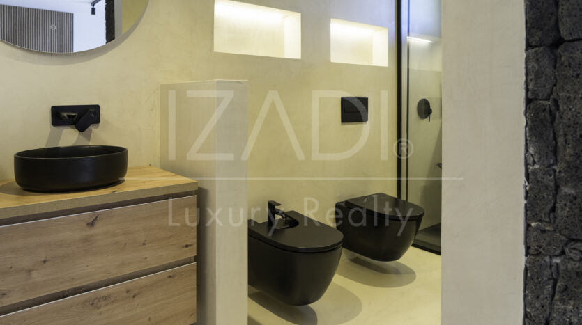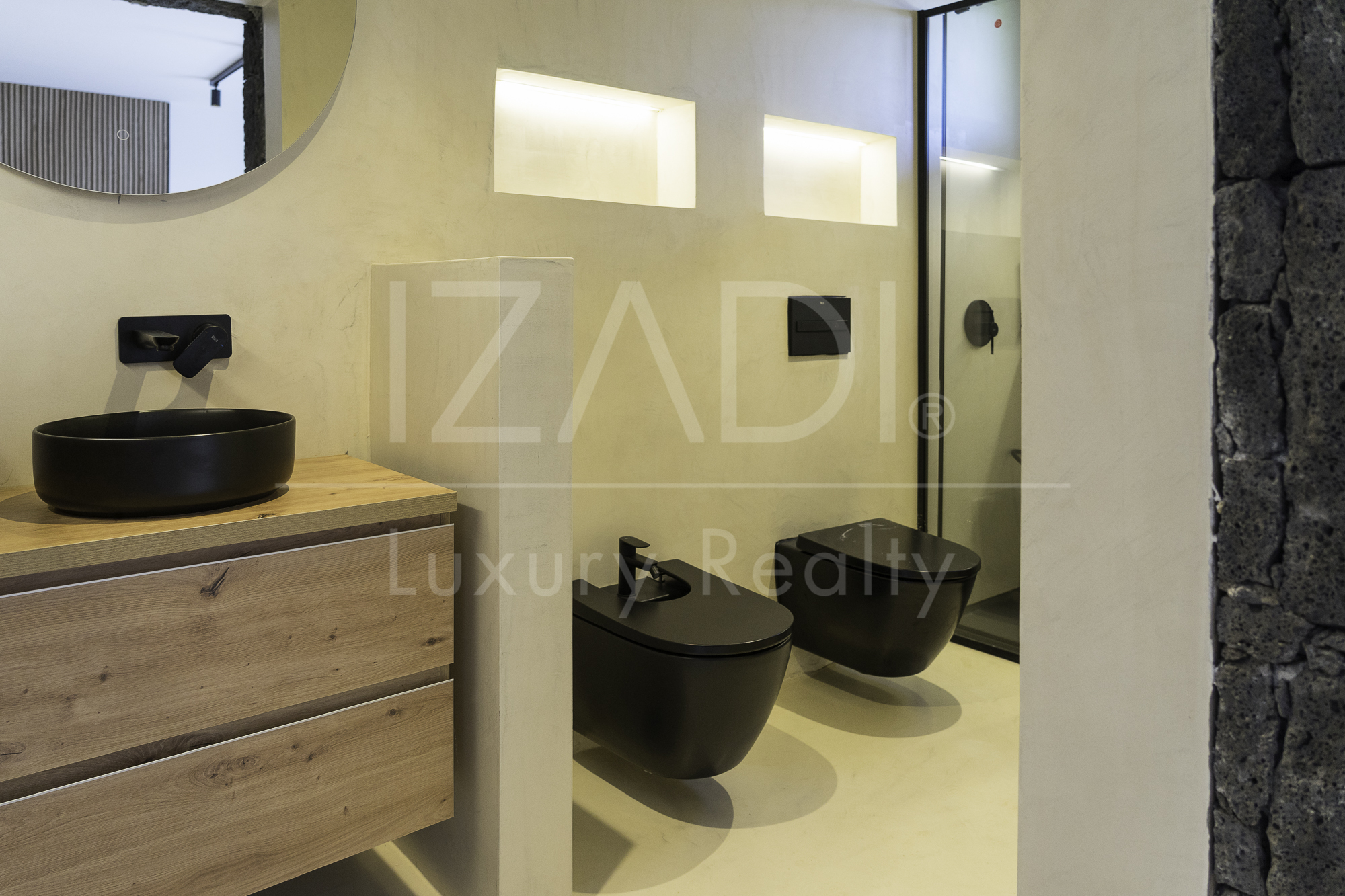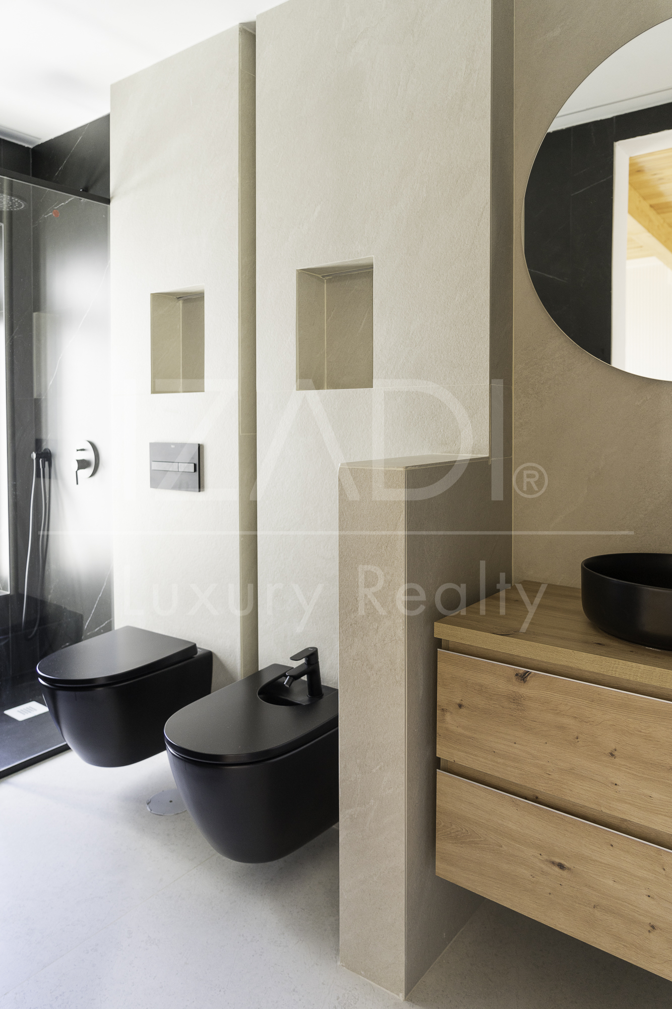 With over 600 m² of living space on a private 2,000 m² plot, the house combines the power of the landscape with the serenity of contemporary design. It is distributed over two floors, with six bedrooms and seven bathrooms, each finished in black porcelain and featuring natural oak details. Parquet and microcement floors, indirect lighting with LED moldings, and electric curtains create a warm, functional, and sophisticated atmosphere.